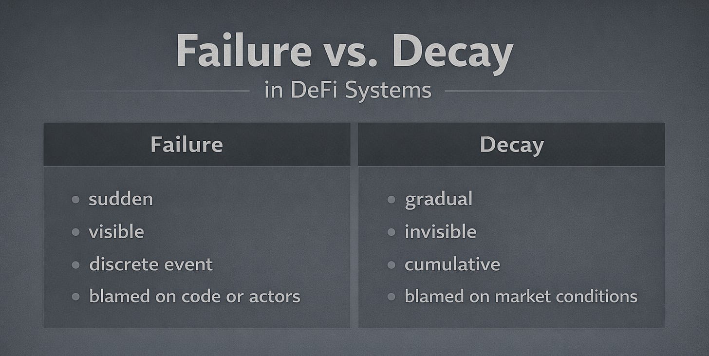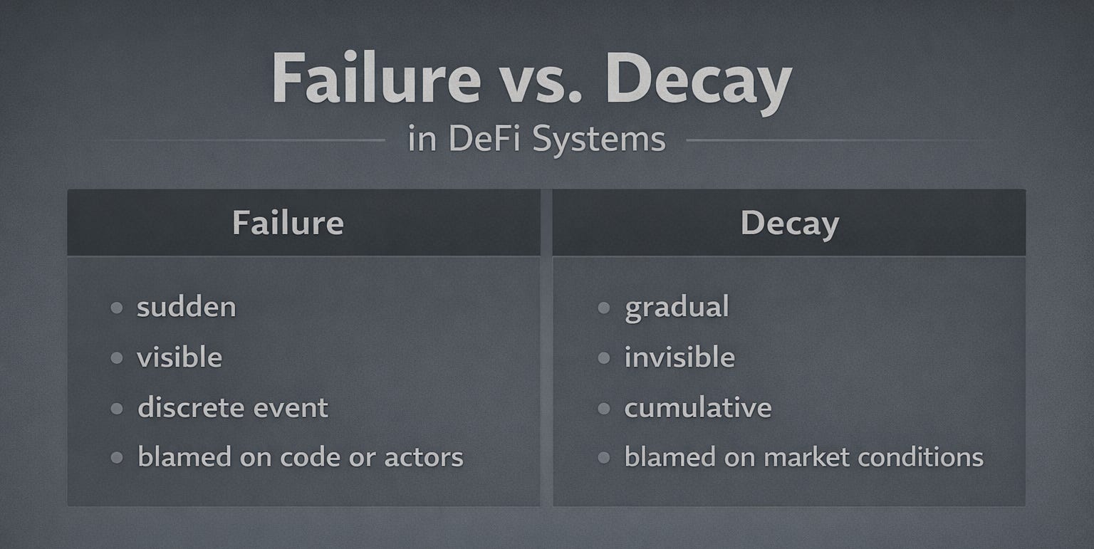 Most DeFi systems go out with a whimper rather than a bang. They don’t explode. They decay quietly, while functioning as designed.